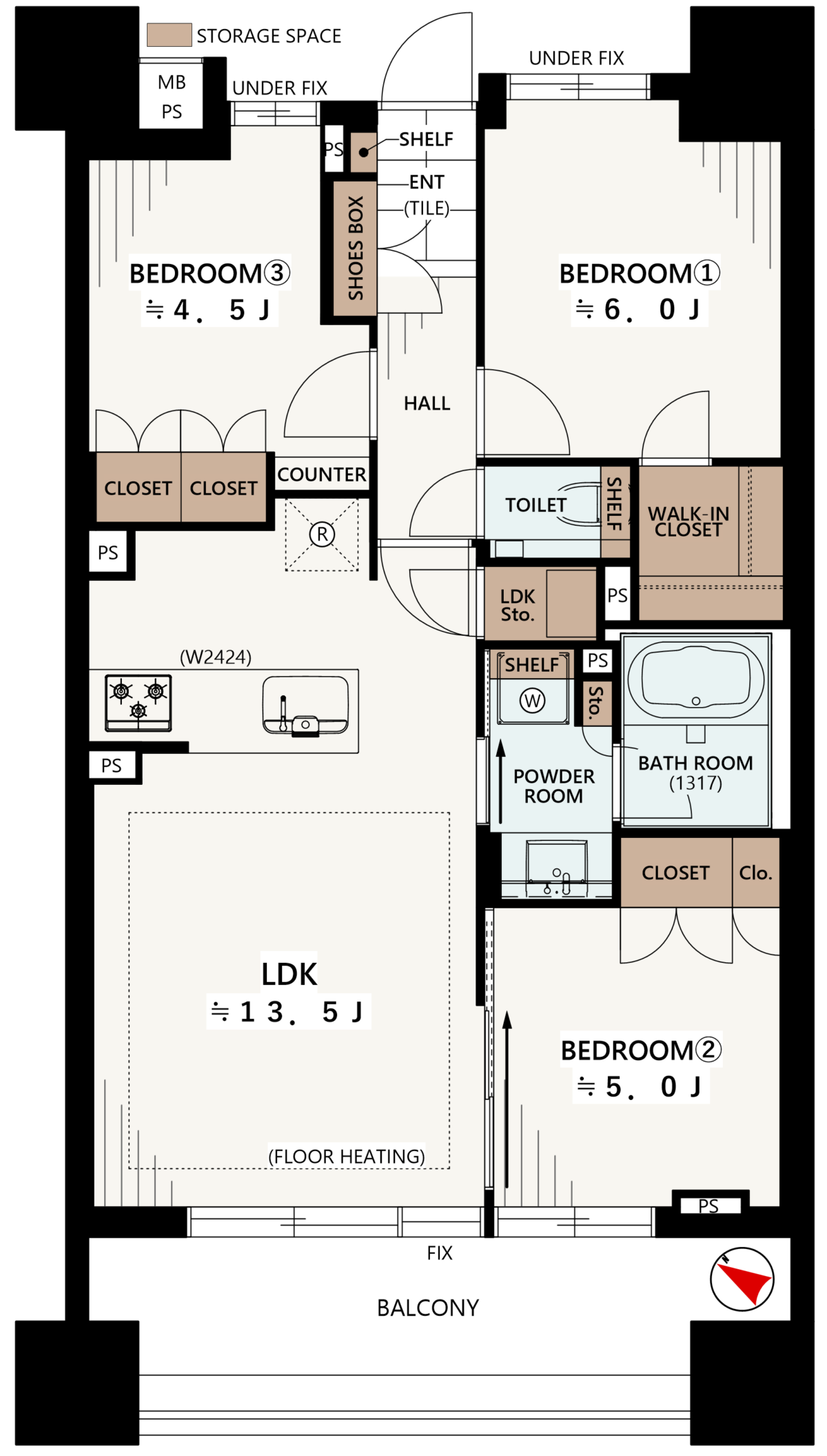 間取はファミリーで利用できる3LDK。ペット足洗い場もございますのでペットがいらっしゃるご家庭にも大変使いやす物件になっております。